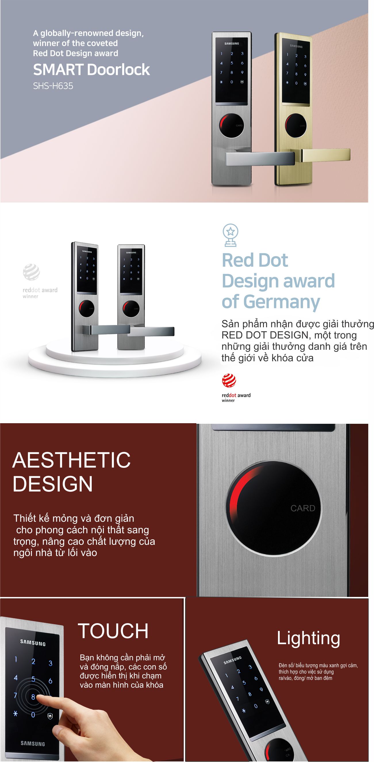- Mở rộng tối đa 20 thẻ, chức năng tự động khóa khi đóng cửa, báo động khi có đột nhập và hỏa hoạn.